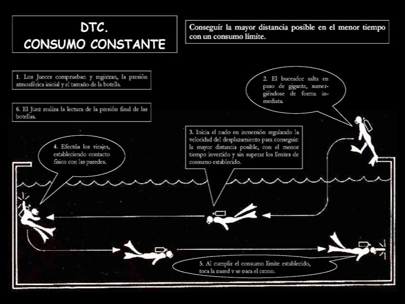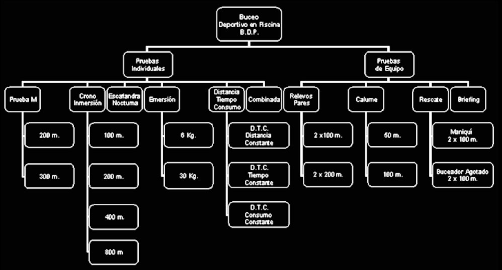 El reglamento contempla seis pruebas individuales y cuatro de equipo. Las individuales son: Prueba M 200 / 300 metros; Crono Inmersión 100/200/400/800 metros; Escafandra Nocturna; Emersión 6/30 Kg.;DTC Distancia-Tiempo-Consumo y la prueba Combinada.