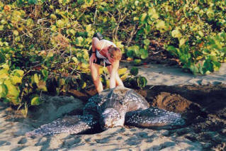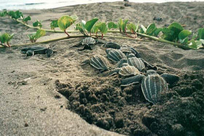 Es la tortuga marina más grande del mundo, la cual llega a medir hasta 2.4 metros de longitud y pesar 500 Kg. o más. Se alimenta principalmente de medusas. Su color predominante es el negro con algunas manchas blancas. Es la tortuga marina con la distribución más amplia: se encuentra en todos los océanos templados o tropicales y llega, incluso, a aguas tan frías de la sub-ártica. En las principales playas de anidación sus poblaciones se han visto reducidas hasta en un 90% durante la última década (Chacón y Aráuz 2001). La extracción de huevos en playas de anidación y la mortalidad de adultos provocada por pesquerías, son las principales causas. Hoy en día, según la Lista Roja de Especies en Peligro de la Unión Mundial para la Naturaleza (UICN), se encuentra en peligro crítico de extinción.