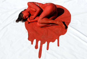 Bandera japonesa representada por una activista pro derechos de los animales durante una protesta en Madrid contra el sacrificio de delfines en Japón. Según los manifestantes, los pescadores japoneses matan cada año, entre octubre y marzo, a miles de delfines y pequeñas ballenas.