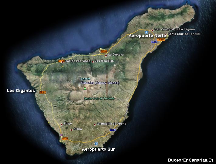 Como llegar a Los Gigantes Aeropuertos El aeropuerto de Tenerife Sur está situado a unos 60 kilómetros de la capital y a 45 Km. de Los Gigantes, Santa Cruz de Tenerife, en el municipio de Granadilla de Abona, al sur de la isla, donde se encuentra el corazón de la zona turística. El aeropuerto de Tenerife Norte está situado a 11 kilómetros de Santa Cruz, en el municipio de San Cristóbal de la Laguna. Si bien este aeropuerto es el de mayor transito es el mas alejado del sur de la isla y de la zona de Los Gigantes.