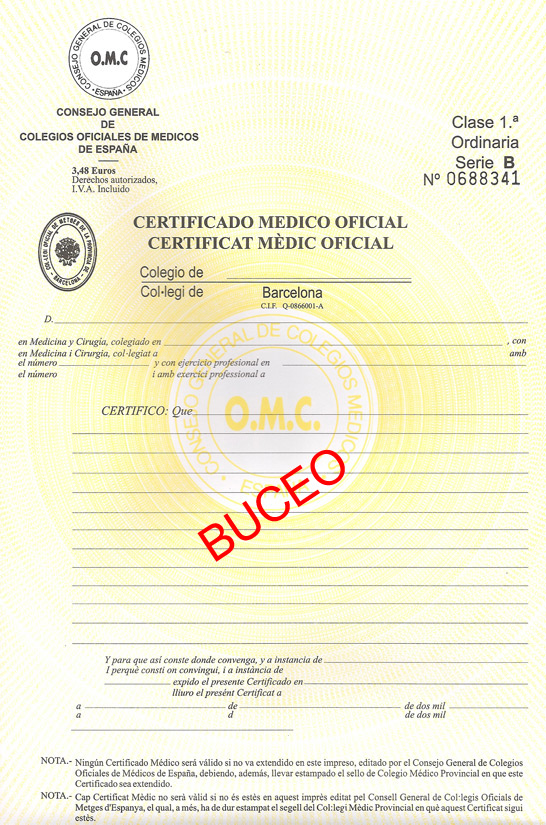 Modelo de certificado oficial para la practica del buceo